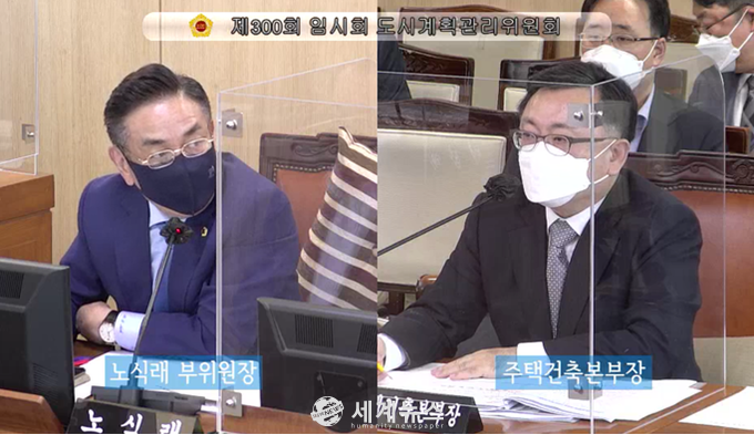 | ▲ 서울시의회 노식래 의원(좌측)이 이촌동 중산시범아파트의 재건축이 차질없이 진행될 수 있도록 서울시가 소유한 부지를 주민들에게 매각할 것을 주택건축본부장에게 촉구하고 있다. |