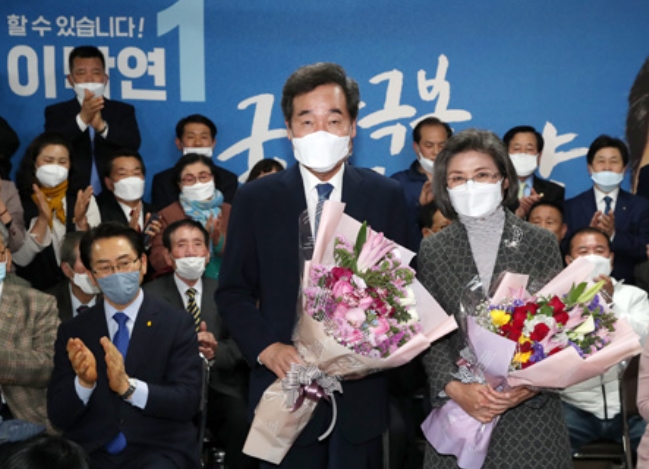 ▲ 서울 종로에 출마한 이낙연 당선자가 부인과 함께 꽃다발을 받아들고 있다. |