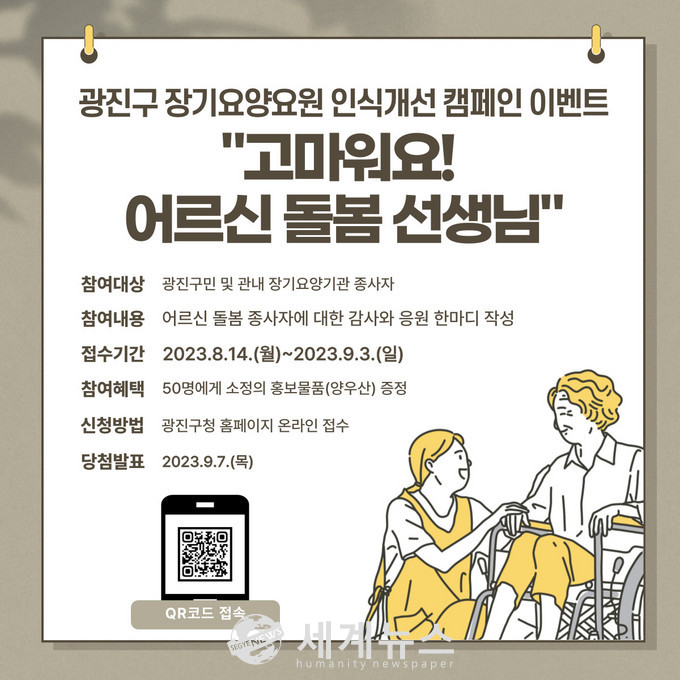 [세계뉴스 전승원 기자] 서울 광진구(구청장 김경호)가 어르신 장기요양요원에 대한 사회적 인식 개선을 위해 응원 캠페인을 진행한다.