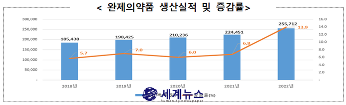 [세계뉴스 차성민 기자] 식품의약품안전처(처장 오유경)은 2022년 국내 의약품 생산실적이 28조 9,503억원으로 전년(25조 4,906억 원)대비 13.6% 증가하며 역대 최고치를 기록했다고 밝혔다.