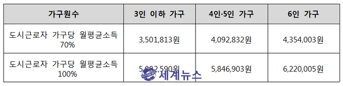 도시근로자 가구당 월평균 소득 70%는 4인·5인 가구의 경우 월 평균 총 수입이 409만 원 수준이다.