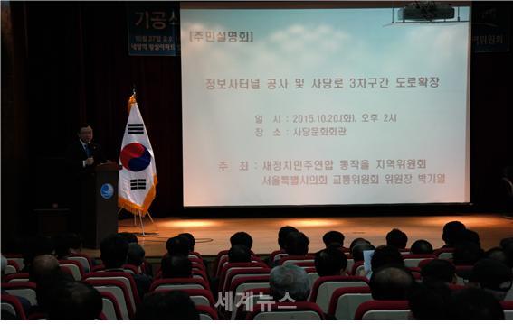 ▲ 서울시의회 교통위원회 박기열 위원장(새정치민주연합, 동작3)은 20일 오후2시부터 ‘정보사터널 공사 및 사당로 3차구간(구 범진여객~솔밭로 입구) 도로확장공사 주민설명회’를 개최하여 지역 현안 사업에 대한 설명을 하고 있다. © 세계뉴스 |