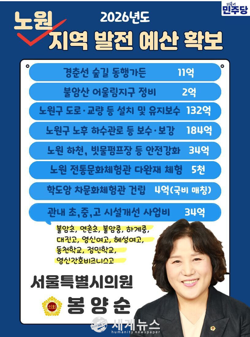 [세계뉴스 = 윤소라 기자] 서울시의회 봉양순 의원(더불어민주당, 노원3선거구)이 2026년도 서울시 본예산에 총 400억여 원 규모의 노원구 지역발전 예산을 확보했다고 발표했다.