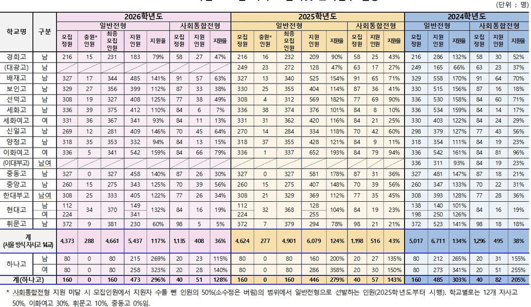 반면, 자사고의 경우 일반전형 1.17:1, 사회통합전형 0.36:1로 두 전형 모두 지원율이 하락했다. 하나고는 예외적으로 일반전형에서 2.96:1로 소폭 상승했으나, 사회통합전형은 1.28:1로 다소 감소했다.
