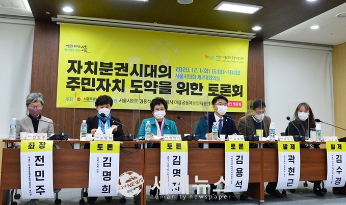 [세계뉴스 정서영 기자] 서울시의회 행정자치위원회 김용석 의원(더불어민주당, 도봉1)은 서울시 마을공동체종합지원센터와 공동 주관으로 ‘자치분권시대의 주민자치 도약을 위한 토론회’를 지난 1일 개최했다.
