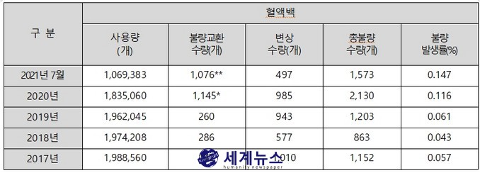 또 혈장 성분채혈키트 불량은 △2017년 784개, △2018년 1,058개, △2019년 954개, △2020년 1,126개, △2021년 604개(7월 기준)이며, 혈소판 성분채혈키트 불량은 △2017년 1,636개, △2018년 1,731개, △2019년 2,041개, △2020년 1,830개, △2021년 1,042개(7월 기준)에 달한다.