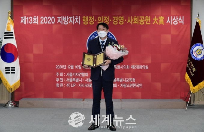 [세계뉴스 전승원 기자] 서울시의회 환경수자원위원회 김정환 위원장(더불어민주당, 동작1)이 10일 서울시의회 제2대회의실에서 열린 ‘제13회 2020 지방자치 행정·의정·경영·사회공헌 大賞 시상식’에서 의정부문의 대상을 수상했다.