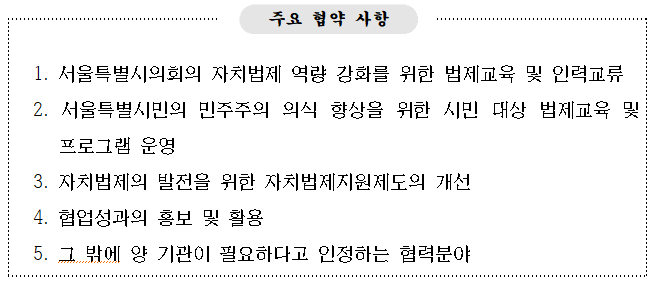 - 서울시의회 자치법제 역량 강화 및 시민 교육프로그램 등 협력
