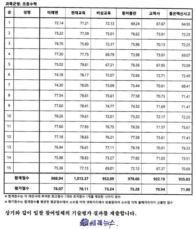 ▲ 2017학년도 국정도서 발행자 선정 ‘기술평가 집계표’. (출처=교육부) |