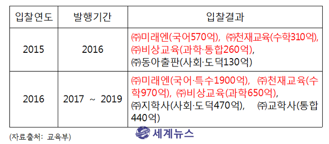 교육부로부터 입수한 자료를 분석한 결과 미래엔, 천재교육, 비상교육은 평균 87.3%의 낙찰률로 교과서 출판권을 따낸 것으로 확인됐다.