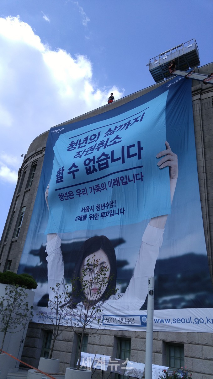 ▲ 4일 오후 3시경 서울시는 시청사 건물에 ‘청년의 삶까지 직권취소 할 수 없습니다’ 대형현수막을 내걸고 복지부와 일전을 알렸다. © 세계뉴스 |