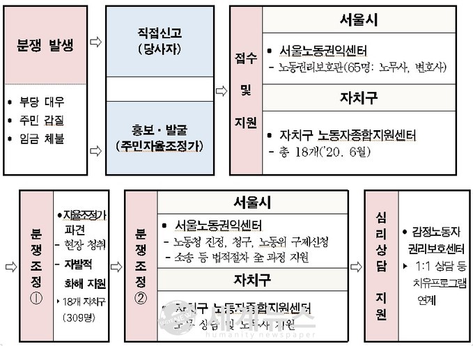 부당해고, 임금체불, 갑질 등 피해를 입거나 갈등에 직면한 경비노동자가 센터에 전화로 신고하면 갈등이 발생한 해당 아파트 단지에 갈등조정전문가인 ‘우리동네 주민자율조정가’를 파견해 당사자 간 화해를 이끌어낸다. 자발적 화해가 어려울 때는 공인노무사와 변호사로 구성된 ‘서울시 노동권리보호관’이 산재처리는 물론 부당해고 사례 구제 등에 나선다.