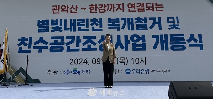 [세계뉴스 정서영 기자] 서울특별시의회 문화체육관광위원회 유정희 의원(더불어민주당, 관악4)이 지난 5일 오전 10시 관악산 신림로 23 일대 관악산 으뜸공원 도림천(별빛내린천) 특설무대에서 개최한 ‘관악산~한강까지 연결되는 별빛내린천 복개철거 및 친수공간조성사업 개통식’에 참석했다.