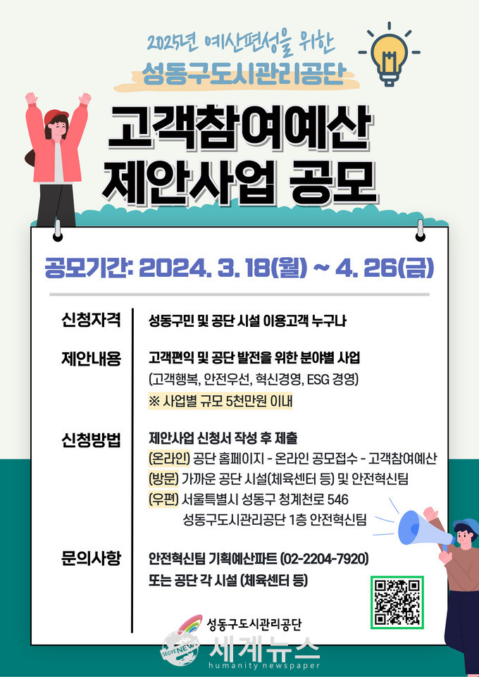 [세계뉴스 조홍식 기자] 성동구(구청장 정원오) 산하 성동구도시관리공단(이사장 김종선, 이하 ‘공단’)은 고객들이 직접 예산편성과정에 참여하는 2025년 고객참여예산 제안사업 공모를 추진한다고 밝혔다.