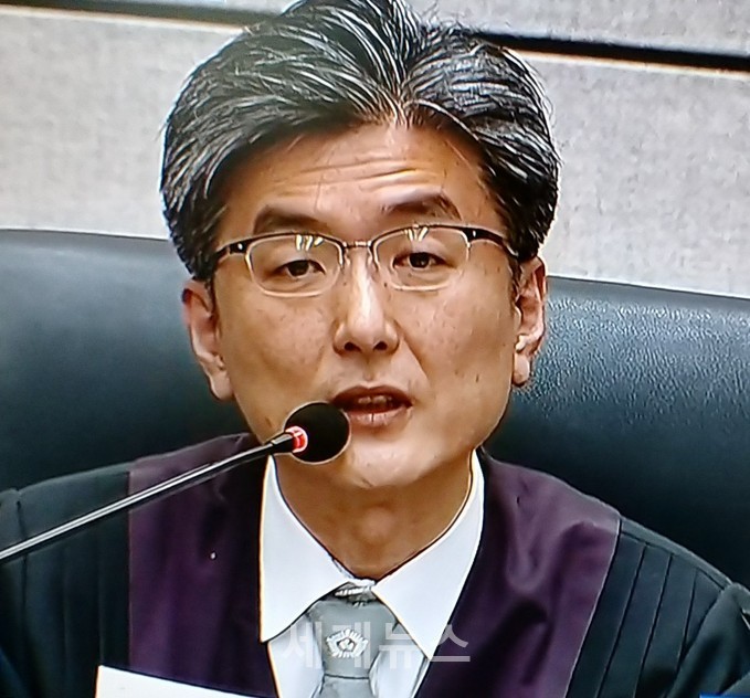 [세계뉴스] 차성민 기자 = 6일 오후 서울 서초구 서울중앙지법 417호 대법정에서 열린 박근혜 전 대통령의 국정농단 사건 1심 선고 공판에서 김세윤 판사가 공소사실을 읽고 있다.