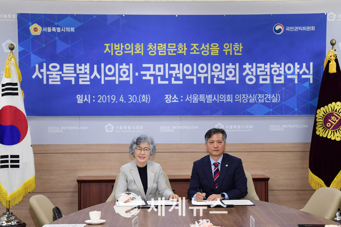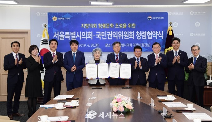 [세계뉴스] 전승원 기자 = 서울특별시의회(신원철 의장)는 반부패·청렴 정책의 주무부처인 국민권익위원회(박은정 위원장)와 30일 서울특별시의회 의장실에서 청렴문화 조성을 위한 업무협약을 체결했다.