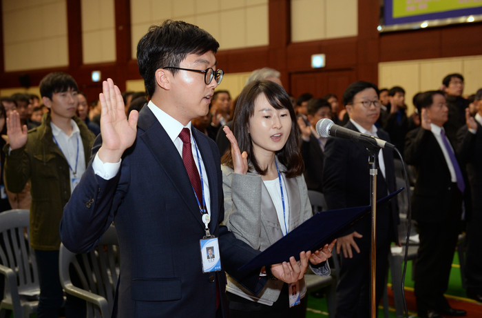 ▲ 동대문구 행동강령실천결의대회에서 직원들이 청렴선서를 하고있다. (사진=지난해 11월 3일 결의대회 모습) © 세계뉴스 |
