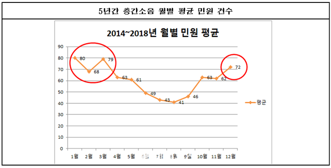 또한, 2014~2018년 5년 동안의 통계에 따르면 실내 활동이 증가하는 겨울철인 12월부터 3월까지의 민원이 평균적으로 가장 많이 들어온 것으로 나타났다.