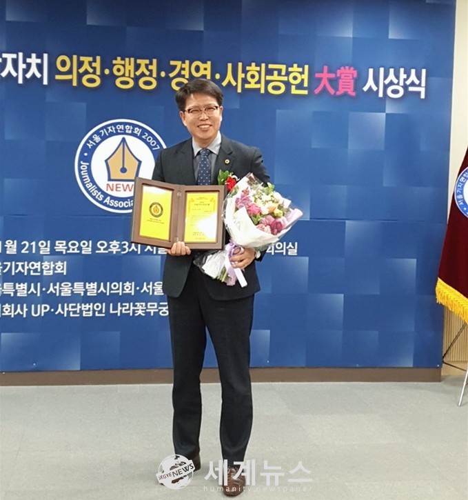 [세계뉴스 정서영 기자] 강동길 서울시의원(더불어민주당, 성북구 제3선거구)은 21일 서울특별시의회의원회관 제2대회의실에서 열린 서울기자연합회 ‘2019 지방자치 행정·의정·경영·사회공헌 大賞’ 시상식에서 ‘지방자치 의정 대상’을 수상했다.