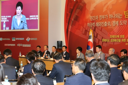 박 대통령은 이날 대한상공회의소 국제회의장에서 열린 '경제 5단체 초청 경제외교 성과 확산을 위한 토론회'에 참석, "내수하는 기업은 내수만 생각하고 수출 기업은 수출만 생각할 필요가 없는 세상"이라며 기업인들의 도전 정신을 당부했다.