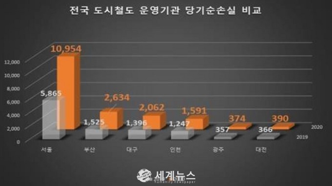 | ▲ 2019년 및 2020년 전국 도시철도 운영기관의 당기순손실을 비교한 표와 그래프. |