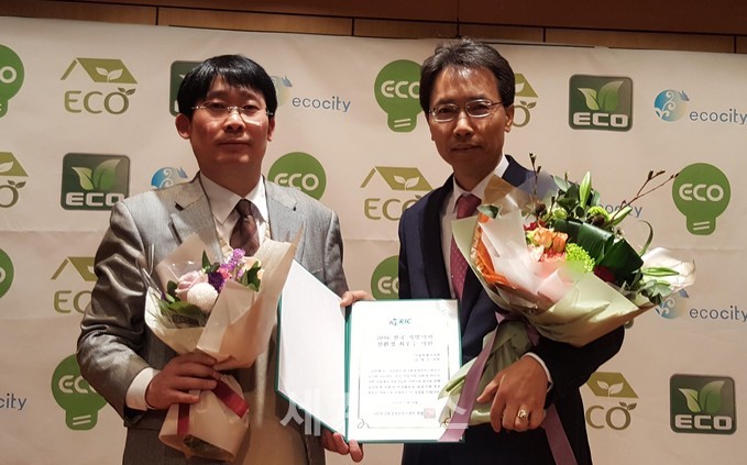 ▲ 29일 서울신용보증재단 대강에서 열린 ‘2016 전국 지방의회 친환경 최우수의원” 시상식에서 김광수(오른쪽) 서울시의원이 4년 연속 친환경 최우수의원에 선정됐다. © 세계뉴스 |