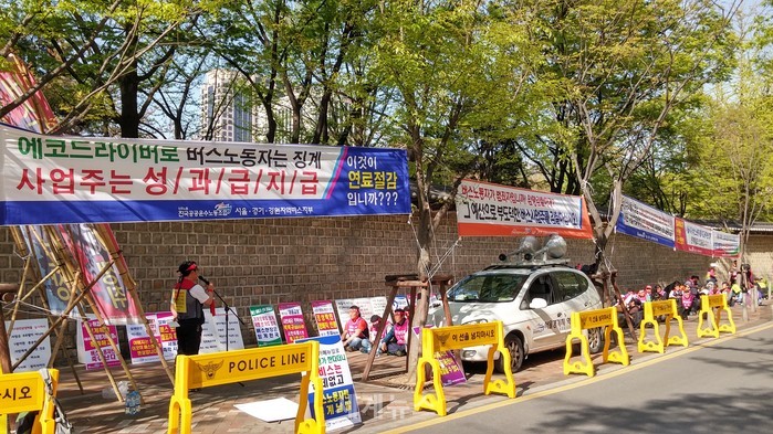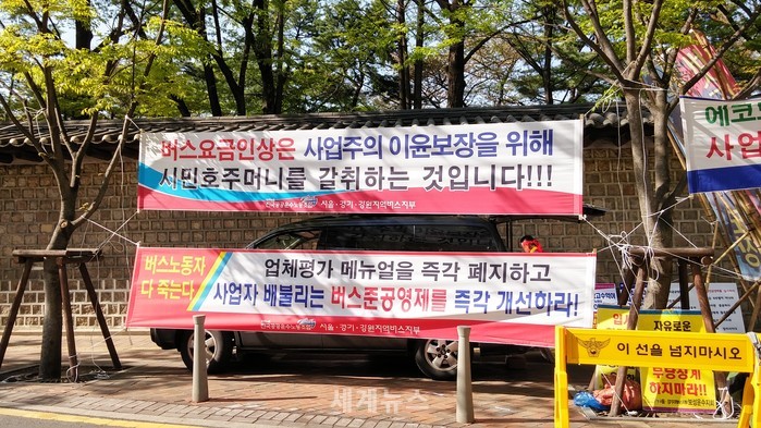 [세계뉴스 차성민 기자] 전국공공운수노동조합 서울·경기·강원지역버스지부 150여명의 노조원은 21일 서울시청 별관 덕수궁 돌담길에 모여 버스요금인상은 사업주의 이윤보장을 위해 시민호주머니를 갈취하는 것이라고 주장하며 농성을 벌이고 있다.