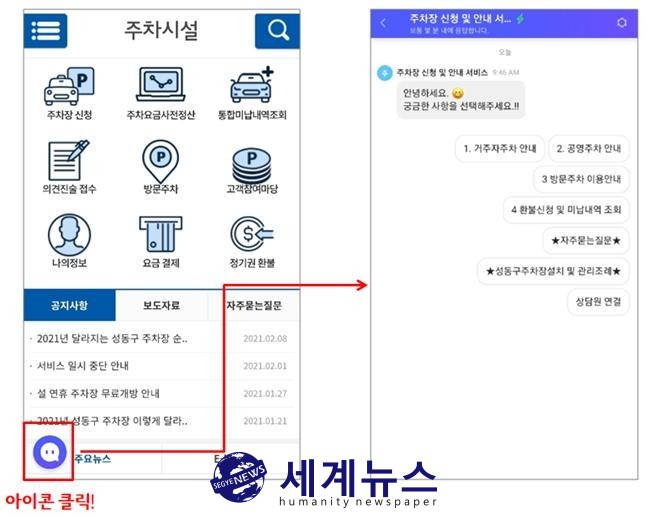 [세계뉴스 조홍식 기자] 성동구도시관리공단(이사장 장기천)이 주차장 이용문의 및 안내를 위한 ‘채널톡’운영으로 비대면 온라인 채팅상담 서비스를 강화한다고 16일 밝혔다.
