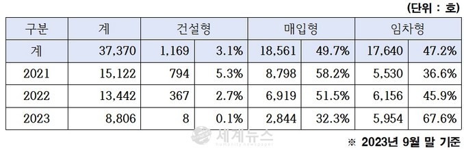 최근 3년간 임대주택 유형별 공급현황을 보면 2021년 36.6%이던 임차형 임대주택의 비율이 2022년 45.9%에 이어 올해는 9월말 현재 3분의 2가 넘는 67.6%까지 늘어났다. 이는 실적 부풀리기 답습의 전형적인 수법으로 읽힌다.