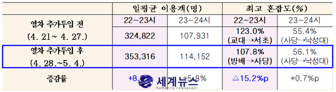 열차 추가 투입 결과, 투입 전 주(4.21.~4.27.) 대비 22시~23시 이용객은 8.8% 증가하였으나 최고 혼잡도는 오히려 15.2%p 감소한 것을 확인할 수 있었다.