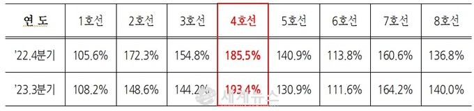 | ▲ 호선별 혼잡도 현황(’23.3분기 기준). |