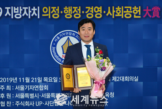 [세계뉴스 정서영 기자] 송정빈 서울시의원(더불어민주당,동대문 1선거구)이 21일 서울시의회 의원회관 2층 대회의실에서 열린 서울기자연합회(회장 정상린) 주관 ‘제12회 2019 지방자치 행정·의정·경영·사회공헌 대상 시상식’에서 서울시 발전을 위한 의정활동과 지역현안 해결 등의 성과를 인정받아 ‘2019 지방자치 의정 대상’을 수상했다.