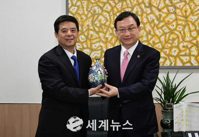 ▲ 지난 14일 서울시의회 박기열 부의장(오른쪽, 더불어민주당, 동작3)은 본관 부의장실에서 베이징시의회 쑨 쓰 차오우 부비서장(왼쪽)을 접견하고 도자기 선물을 증정받았다. |
