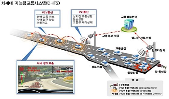 C-ITS는 차량에 장착된 단말기를 통해 주변 차량, 도로변 기지국과 사고, 낙하물, 공사장 정보 등 도로상황에 대한 정보를 교환해 교통사고를 예방하는 시스템이다.