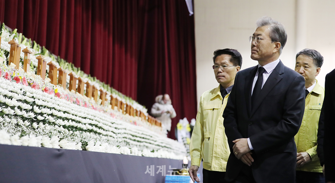 ▲ 밀양 화재현장을 찾은 문재인 대통령. 문 대통령은 27일 경남 밀양시 세종병원 화재참사의 합동분양소를 찾아 “국민께 송구스러운 심정”이라고 말했다. © 세계뉴스 |