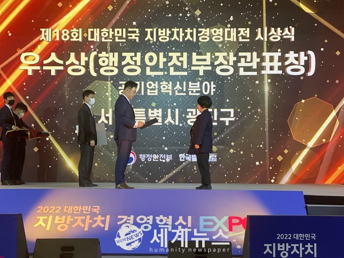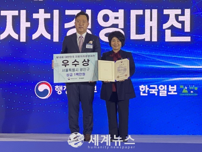 [세계뉴스 전승원 기자] 광진구청이 10일 부산 벡스코에서 개최된 ‘제18회 대한민국 지방자치경영대전’ 시상식에서 행정안전부 장관상 수상의 쾌거를 거뒀다.