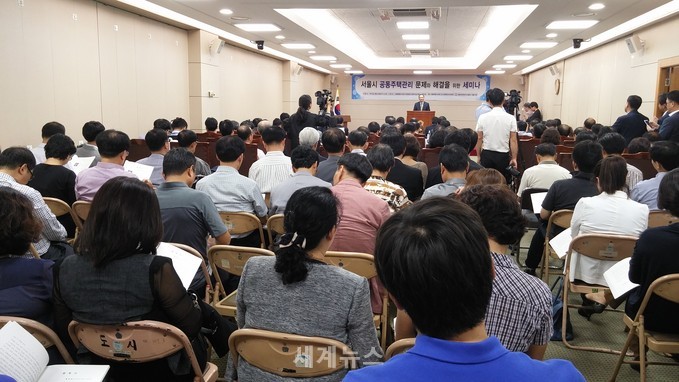 ▲ 23일 오후2시 서울시의회 2층 대회의실에서 '서울시 공동주택관리 문제와 해결을 위한 세미나'를 개최했다. 황장전 대한주택관리사협회 서울시회장이 환영사를 하고 있다. © 세계뉴스 |