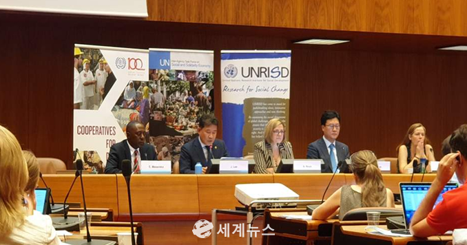 ▲ 이준형 서울시의원(왼쪽 2번째)은 지난 6월 26일 스위스 제네바 국제노동기구(ILO)에서 열린 유엔기구 간 사회경제연대 태스크포스(UN TF SSE) 국제컨퍼런스에 참석해 서울시 사회적경제 활성화 2.0 플랜과 의회의 역할에 대한 사례를 발표하고 있다. |