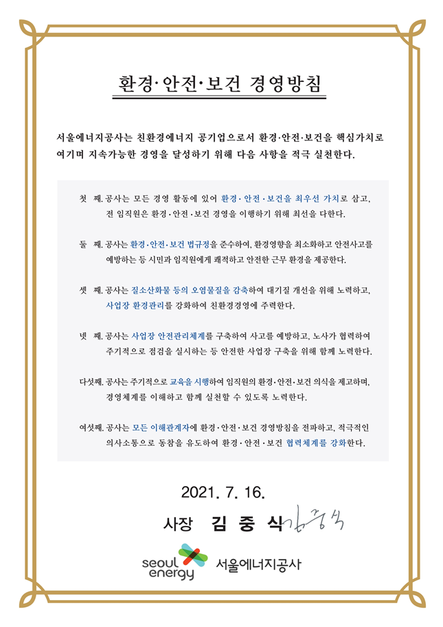 환경‧안전‧보건 경영방침에는 환경‧안전‧보건을 최우선 가치로 삼고 법규정을 준수하며, 질소산화물 등의 오염물질 감축 및 안전관리체계를 통해 쾌적하고 안전한 사업장을 구축한다는 내용이 담겼다.