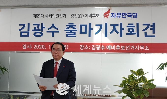 [세계뉴스 전승원 기자] 김광수 예비후보(자유한국당, 서울 광진 갑)가 16일 오전 11시 선거 사무실(광진구 천호대로 676 두루미빌딩 4층)에서 국회의원 공식 출마기자회견을 열었다.