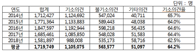 소 의원이 경찰청으로부터 제출받은 자료에 따르면 최근 5년간 전체 형사입건된 사람은 평균 171만 9,749명이다. 경찰은 그 중에서 110만 5,075명을 기소의견으로, 56만 3,577명을 불기소의견으로, 5만 1,097명을 기타의견(이송, 참고인중지)로 검찰에 송치했다. 평균적으로 64.2%의 기소의견율을 보인 것이다.