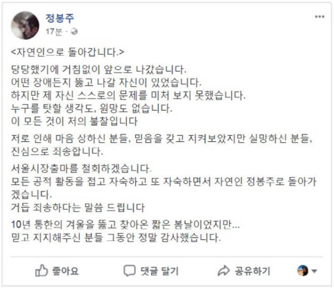 그러면서 “거듭 죄송하다는 말씀 드린다”며 “10년 통한의 겨울을 뚫고 찾아온 짧은 봄날이었지만 믿고 지지해주신 분들 그동안 정말 감사했다”고 했다.