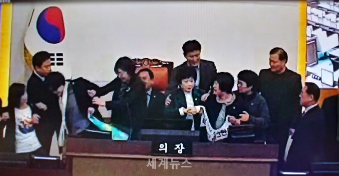 [세계뉴스] 정서영 기자 = 서울시의회 본회의장에서 오는 6·13 지방선거구 획정안을 놓고 아수라장이 됐다.
