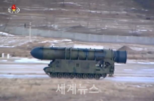 ▲ 북극성2형 중장거리 탄도미사일이 이동발사체에 실려 이동되는 모습. © 세계뉴스 |
