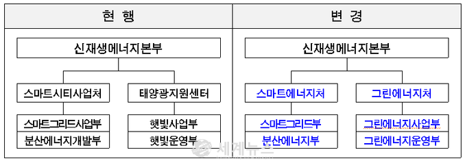 이에 따라 스마트에너지처는 에너지신사업 총괄기능을 정립하고 그린에너지처는 태양광‧풍력에너지 등 재생에너지사업 총괄을 맡는다.
