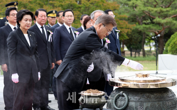 ▲ 문재인 대통령이 6일 오전 서울시 동작구 동작동 국립현충원에서 열린 제62회 현충일 추념식에서 현충탑에 헌화한 뒤 분향하고 있다. © 세계뉴스 |