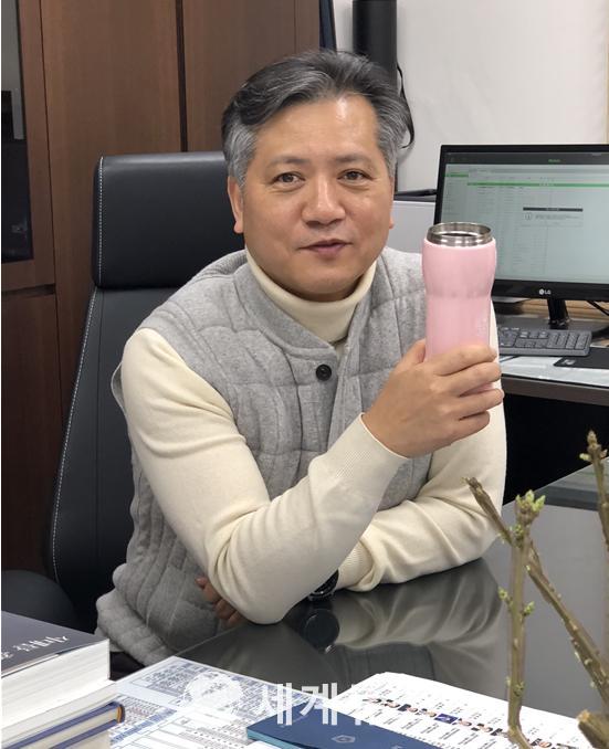 ▲ '플라스틱 프리 챌린지' 캠페인에 동참하고 있는 신원철 의장이 텀블러 사용을 적극 권장하고 있다. |
