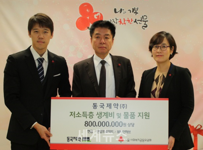 [세계뉴스] 송민숙 기자 = 동국제약(부회장 권기범) '인사돌 사랑봉사단'은 지난 19일 서울시 중구에 위치한 '서울 사회복지공동모금회'를 방문해, 약 8억원 상당의 현금과 헬스케어 제품을 기부했다고 20일 밝혔다.