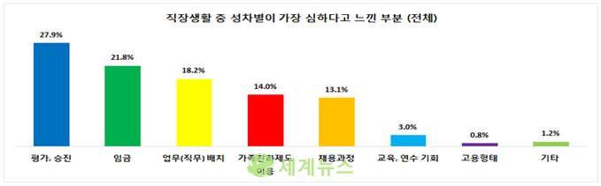 직장 내 성차별을 경험한 응답자들은 성차별이 심하다고 느낀 점으로 ‘평가, 승진(27.9%)’을 가장 많이 꼽았다. ‘임금(21.8%)’, ‘업무(직무)배치(18.2%)’, ‘가족친화제도이용(14%)’, ‘채용과정(13.1%)’ 등이 뒤를 이었다.