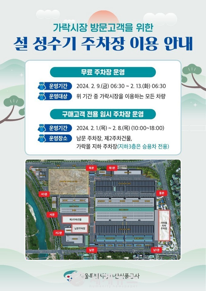 아울러 일반 소비자가 가락시장을 이용하는 데에 불편함이 없도록 2월 1일부터 2월 8일까지 8일간 남문 임시주차장, 제2주차건물, 가락몰 지하주차장을 구매고객 전용 주차장으로 운영하며, 설 연휴 가락시장을 찾는 고객들의 주차요금 부담을 줄이고자 휴장 기간인 2월 9일 오전 6시 30분부터 2월 13일 오전 6시 30분까지 주차장을 24시간 동안 무료 개방한다.